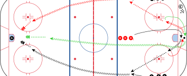 • J1 récupère la passe et remet la rondelle au groupe opposé (3).  Un échange de passe a lieu.