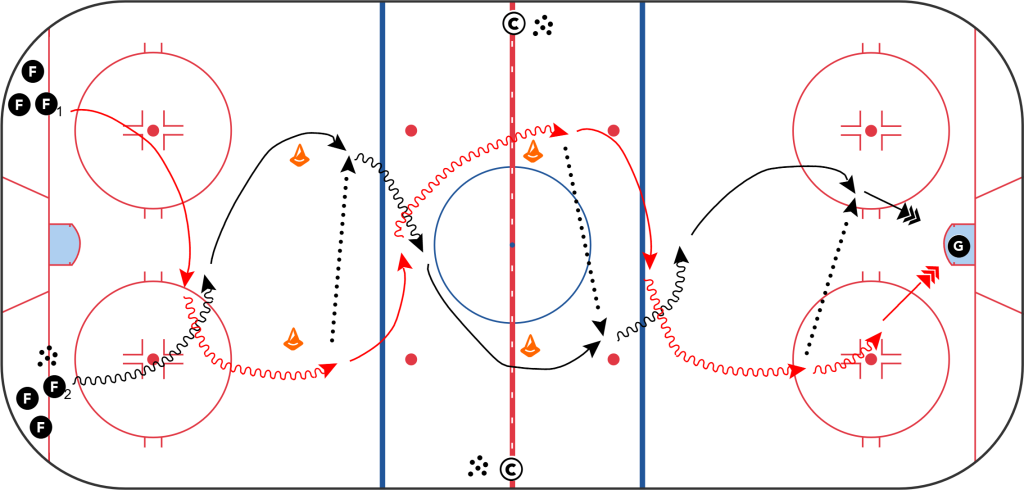 - Au sifflet, les 2 joueurs quittent et celui qui a la rondelle, fait un échange (passe arrière) pour son coéquipier.