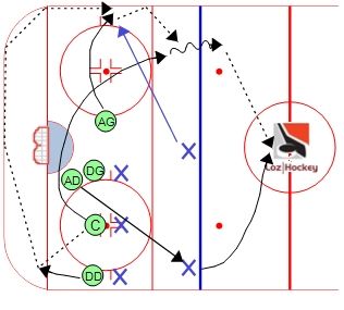 • Le même principe s’applique si la mise au jeu est à la gauche du gardien. AG et AD permutent ainsi que DG et DD