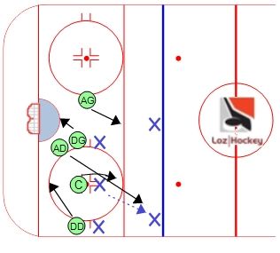 DDFonce à toute vitesse vers la rondelle pour la récupérer une fois que le C gagne la mise au jeuFait une sortie de zone wrap en tirant la rondelle le long de la bande. Il doit s’assurer que la rondelle se rende rapidement à AGLit que la mise au jeu a été perdue et se déplace immédiatement vers le filet pour un support additionnelCouvre le poteau rapprochéUtilise son corps pour bloquer des lancers et non son bâton afin d’éviter des déviations