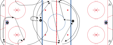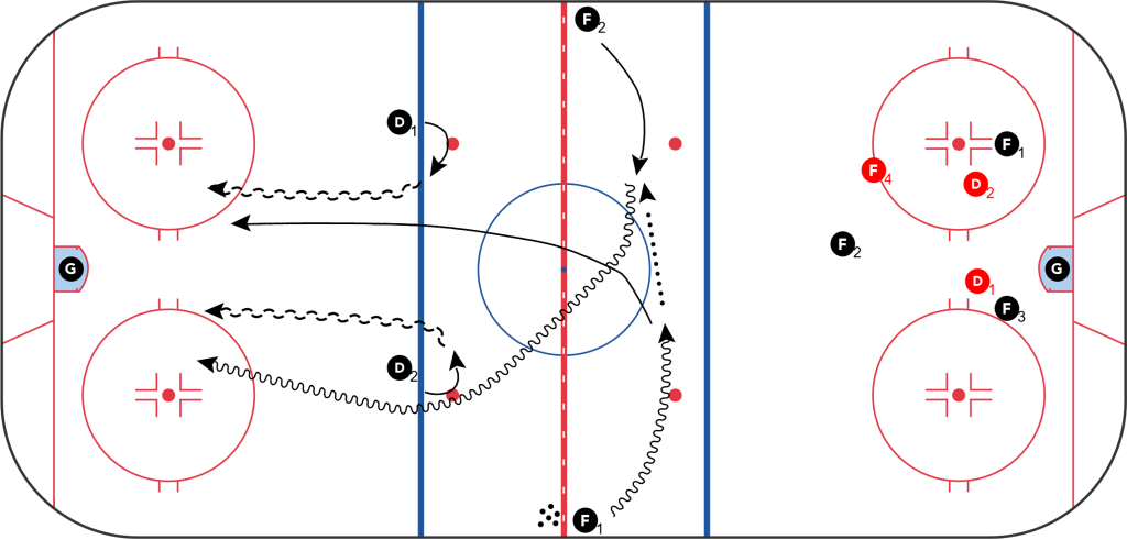 - Lorsque D1 récupère la rondelle, les joueurs transitionnent en mode offensif. D1 initie une sortie de zone avec les autres joueurs tandis que D1 et D2 défensifs viennent réduire leur écart. F4 initie son repli défensif. Donc la sortie de zone se fait à 5vs3