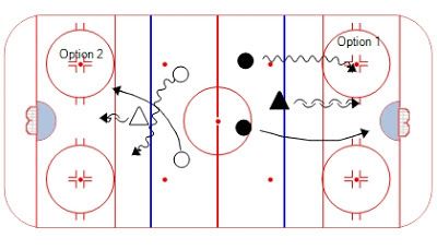 Bien entendu, il y a des pours et des contres pour chacune des options.  L’avantage le plus évident lorsque tu transportes la rondelle linéairement, c’est que la distance pour atteindre la zone offensive est plus courte que si tu transportes la rondelle en diagonale.  Par contre, un attaquant qui transporte linéairement la rondelle est une cible facile à couvrir pour un défenseur.  En fait, si tu patines en linéaire avec un coéquipier, ça devient facile de vous couvrir tous les deux.